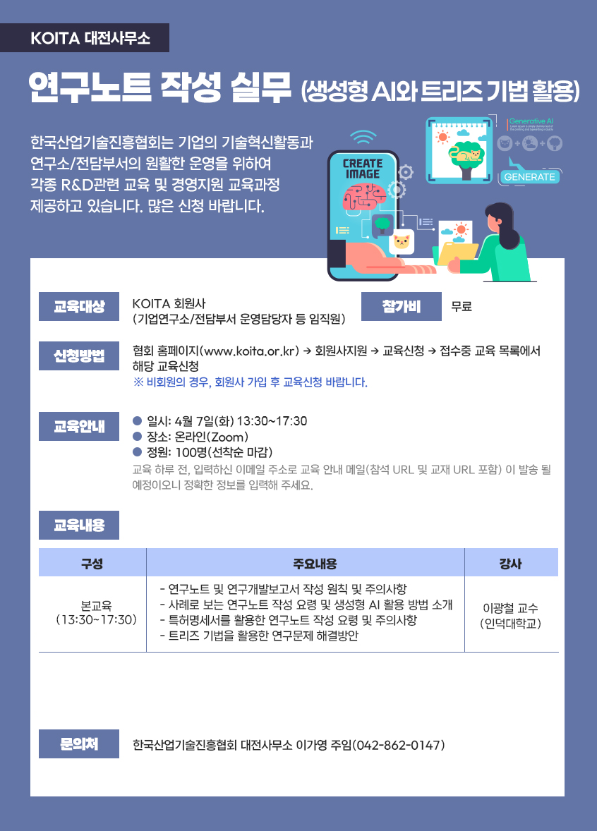 교육정보 교육정보 : 교육명, 장소, 일시, 금액, 담당자, 연락처, 참석가능 인원 [온라인] 연구노트 작성 실무(생성형 AI와 트리즈 기법 활용) 교육명 교육명 [온라인] 연구노트 작성 실무(생성형 AI와 트리즈 기법 활용) 장소 장소 온라인(Zoom) 일시 일시 2026-04-07 13:30~17:30 금액 금액 비회원 : - / 회원 : 무료 담당자 담당자 이가영 연락처 연락처 042-862-0147 정원 정원 100명 교육설명 교육설명 내용 목록 신청하기